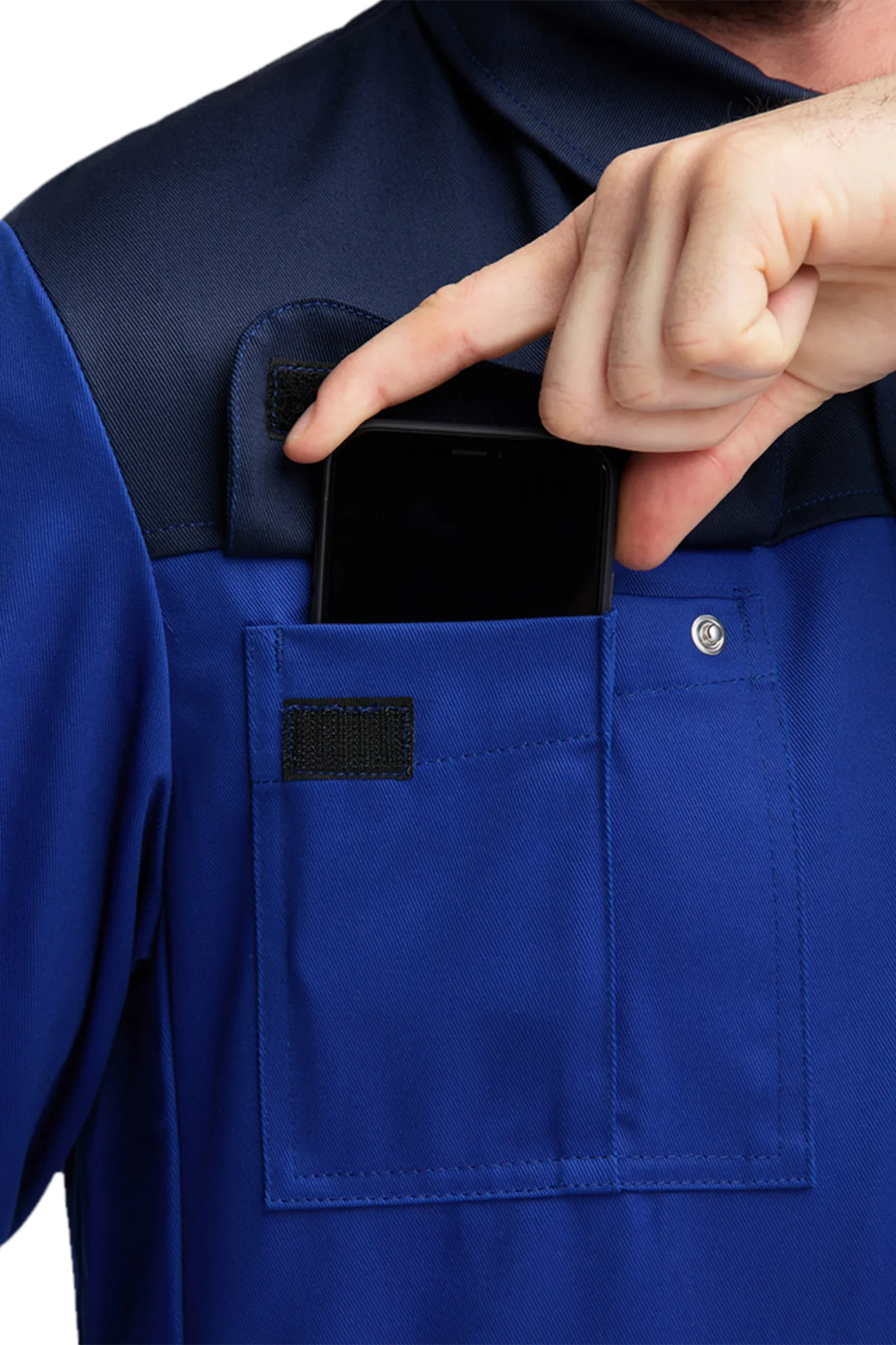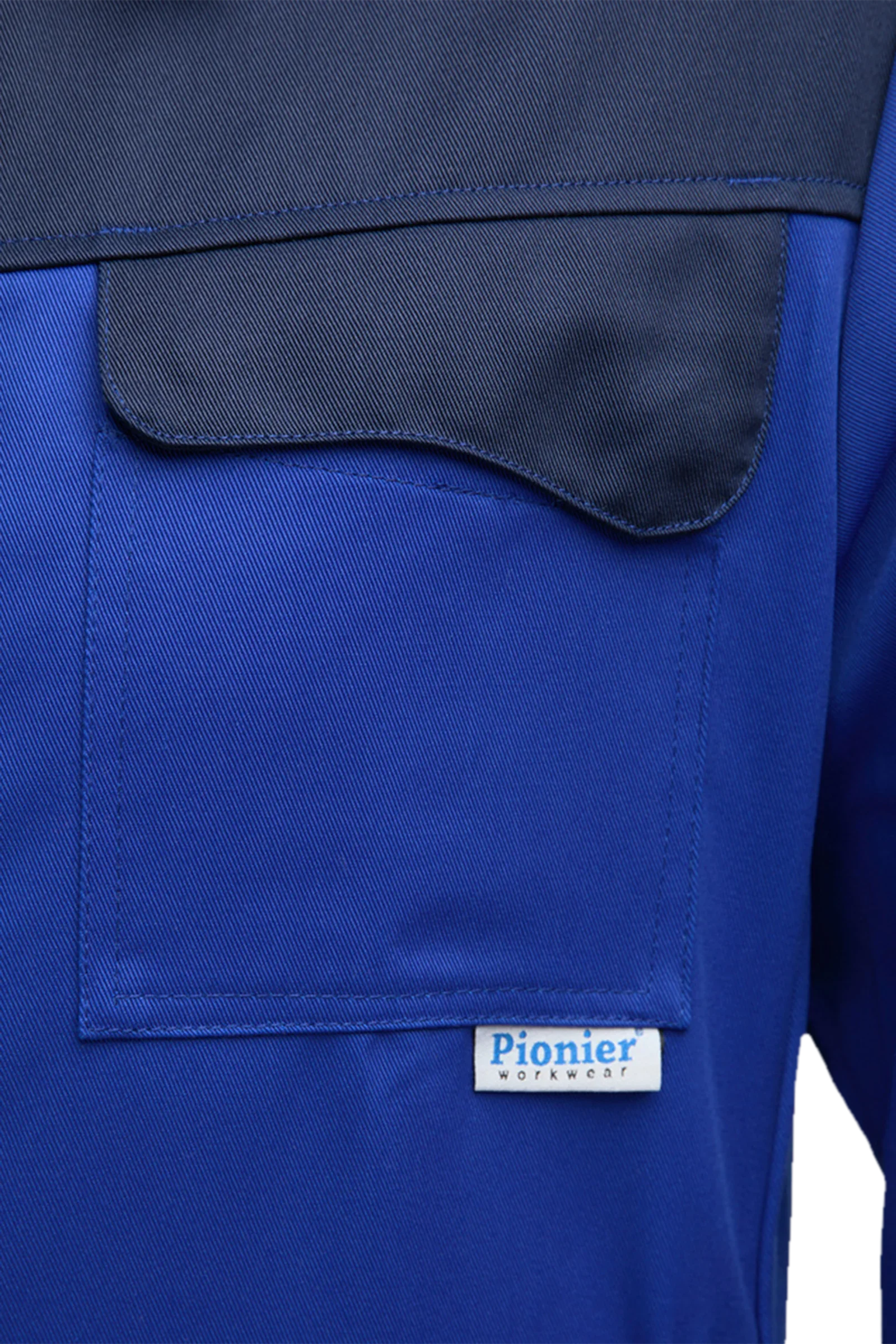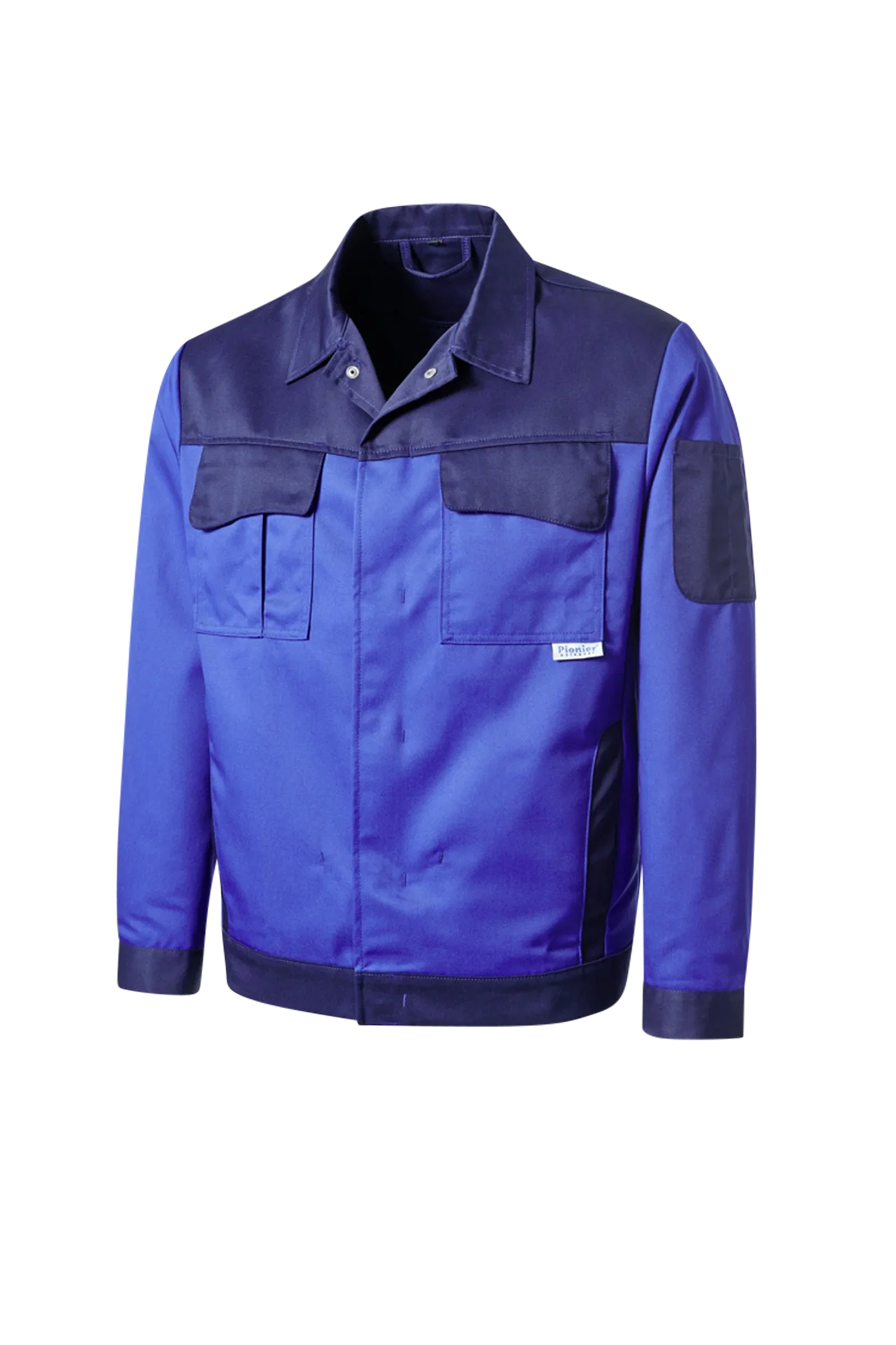 Zweifarbige Bundjacke mit Umlegekragen, verdeckte Druckknopfleiste, zwei Brusttaschen mit Patte und verdecktem Druckknopfverschluss, rechts mit Handytasche inkl. Klettverschluss, eine Ärmeltasche links unterteilt in zwei Stifttaschen, zwei eingesetzte Seitentaschen, Ärmelbündchen mit verdecktem verstellbaren Druckknopfverschluss