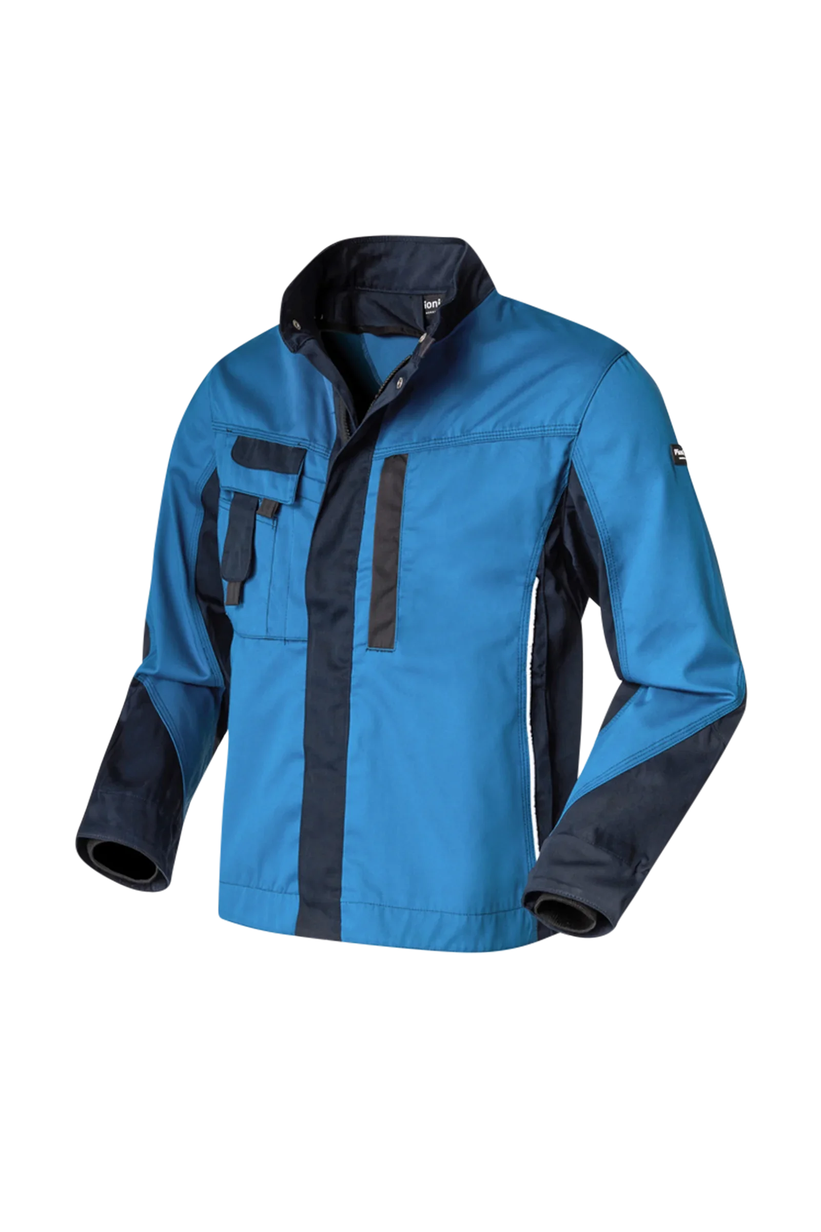 Veste professionnelle bicolore adaptée au leasing, col montant, fermeture à glissière dissimulée, deux poches latérales insérées avec fermeture à glissière dissimulée, poche intérieure, une poche poitrine intérieure insérée avec fermeture à glissière dissimulée, une poche poitrine plaquée à soufflet avec rabat, poche pour stylos, poche plaquée pour téléphone portable sur la poche de poitrine droite, dos extra-long, poignets Pulls Giletsés à l'intérieur, boutons-pression à l'intérieur pour boutonner un gilet intérieur, réglage de la taille par bouton poussoir, passepoil réfléchissant sur le devant et aux coudes