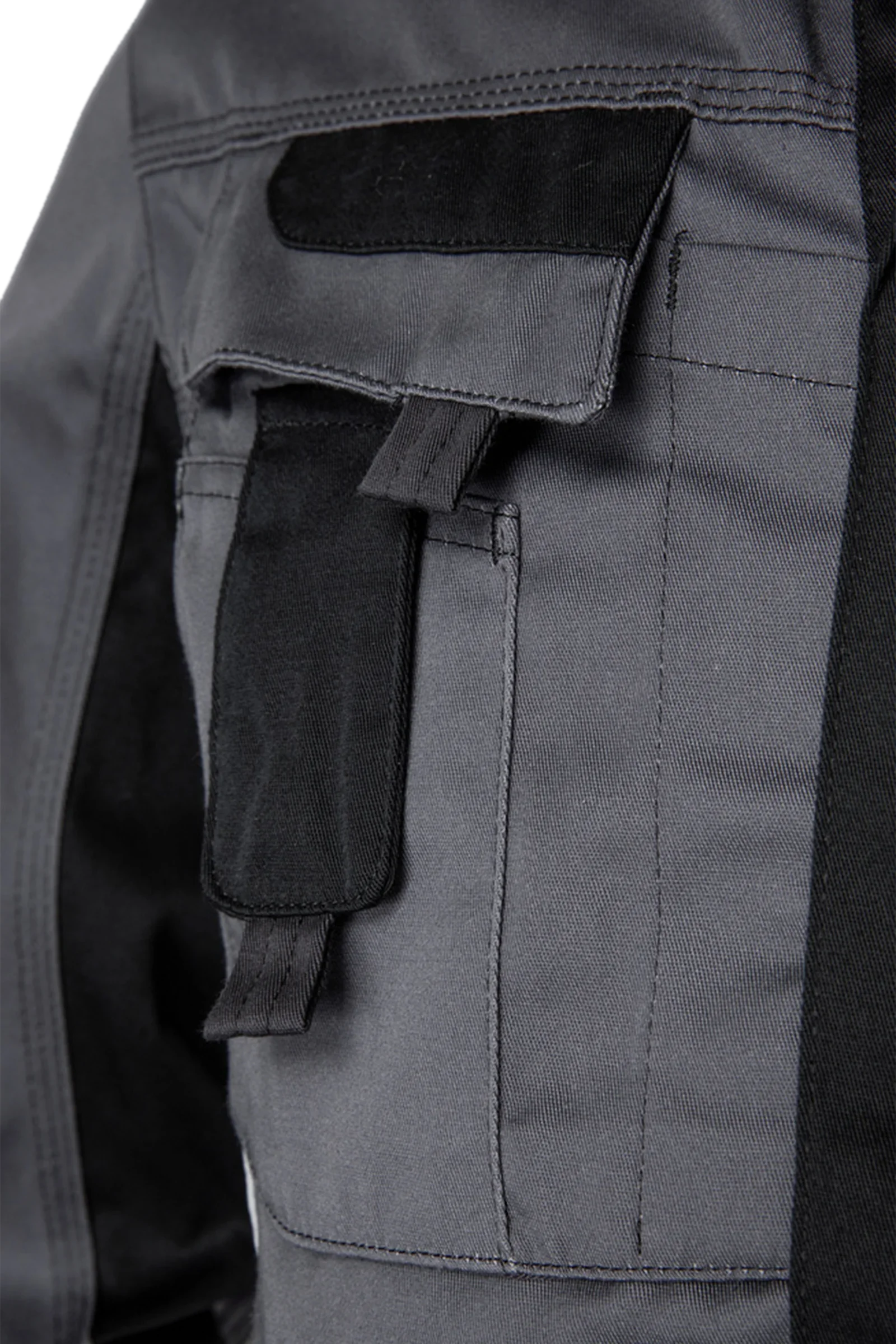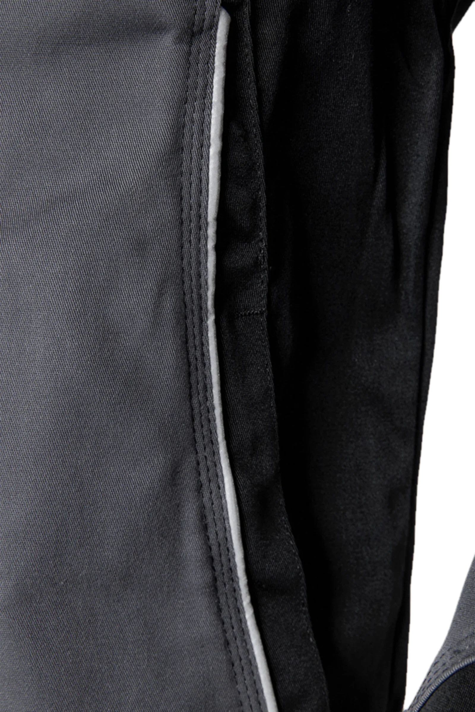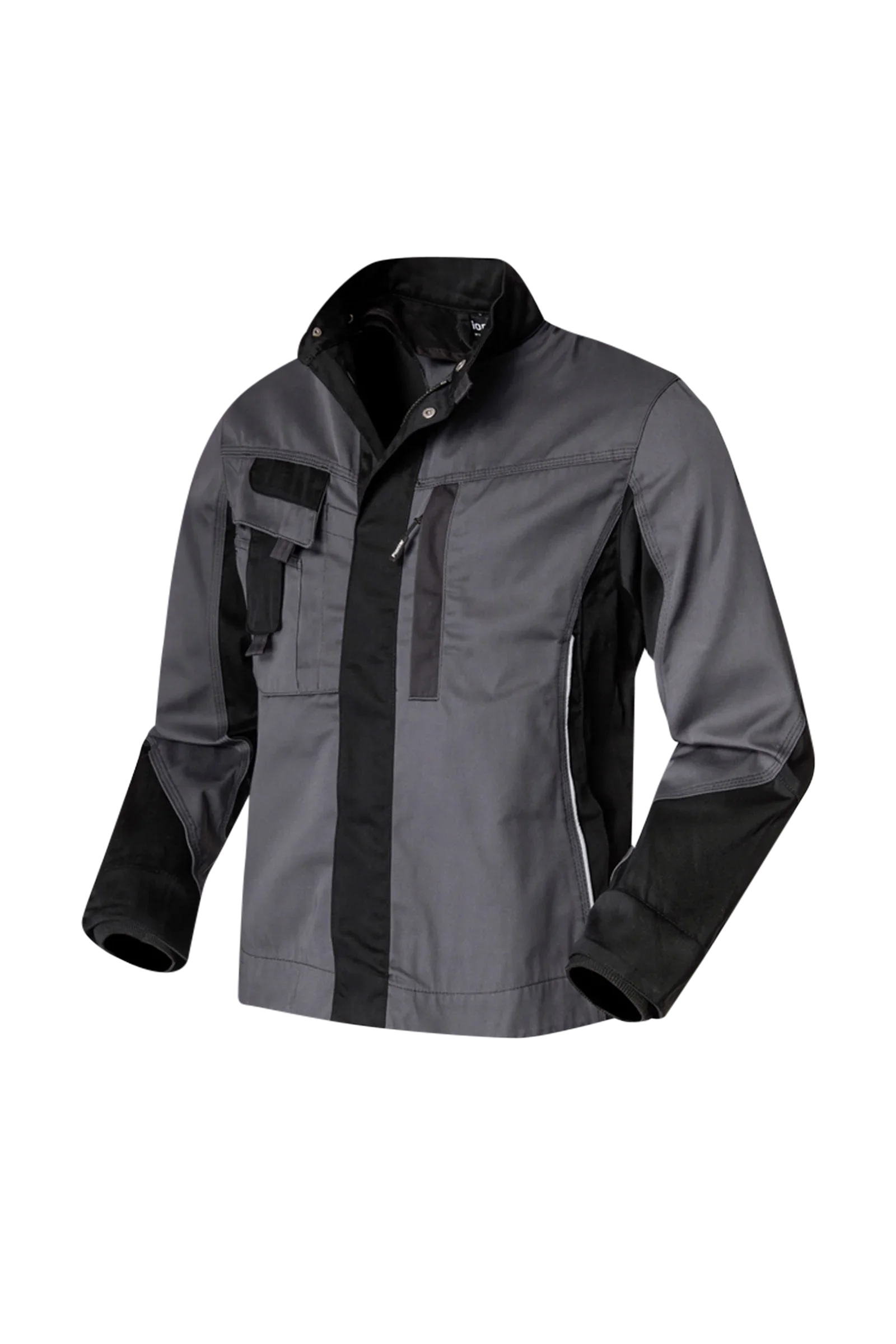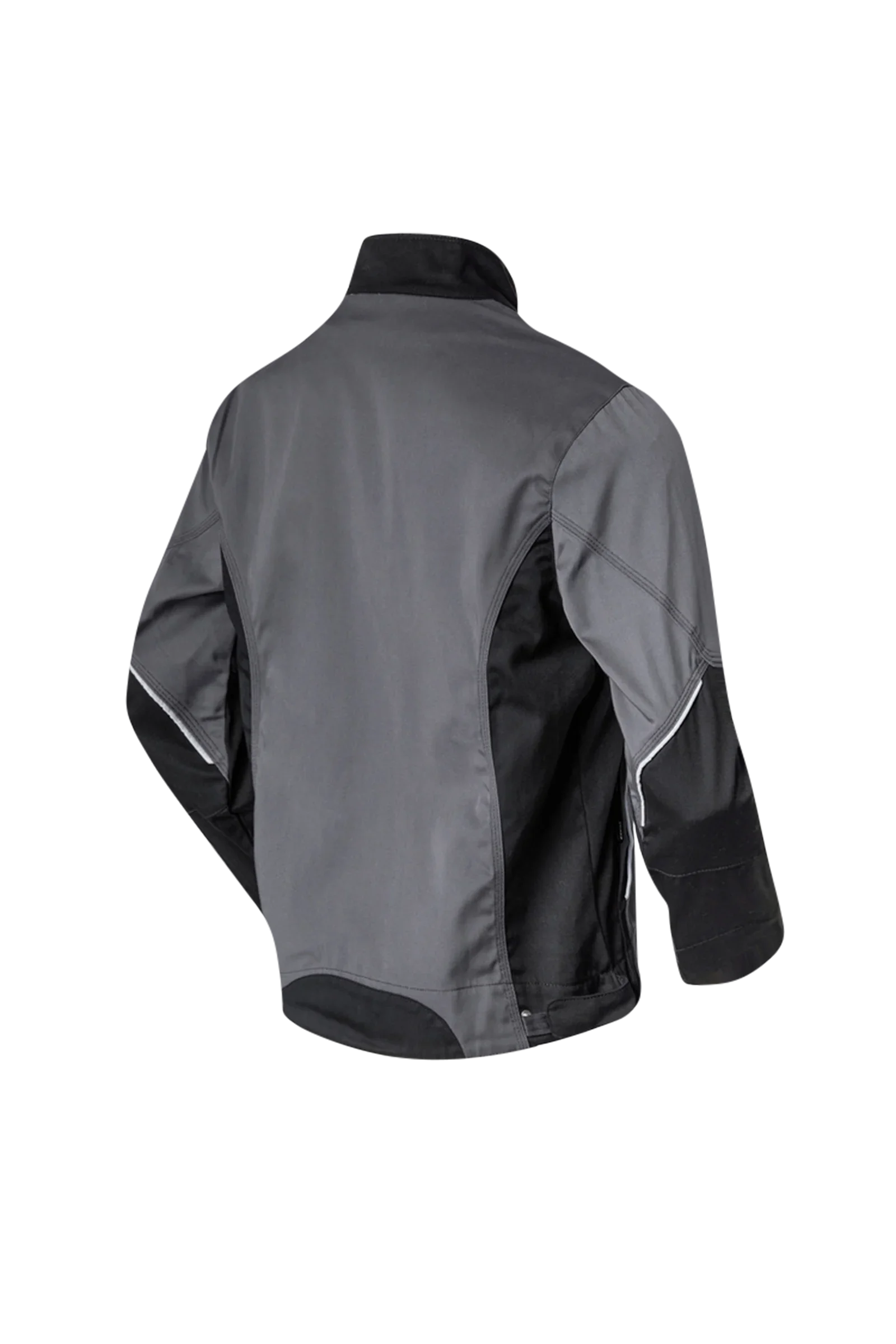 Two-tone waist jacket suitable for leasing, stand-up collar, concealed zipper, two inset side pockets with concealed zipper, inside pocket, one inside inset chest pocket with concealed zipper, one patched bellows chest pocket with flap, pen pocket, patched mobile phone pocket on the right chest pocket, extra long back, inner knitted cuffs, inner press studs for buttoning in an inner vest, waistband width adjustment with press stud tab, reflective piping on the front and elbows