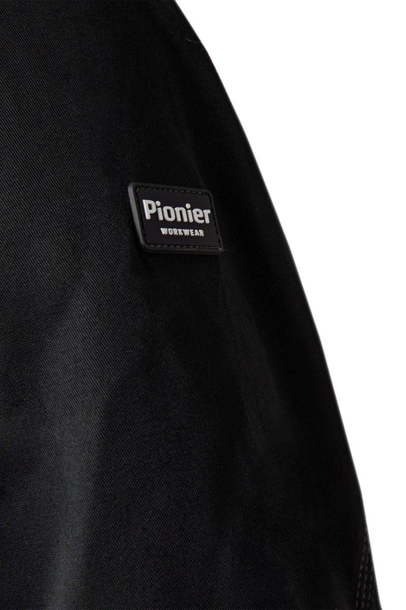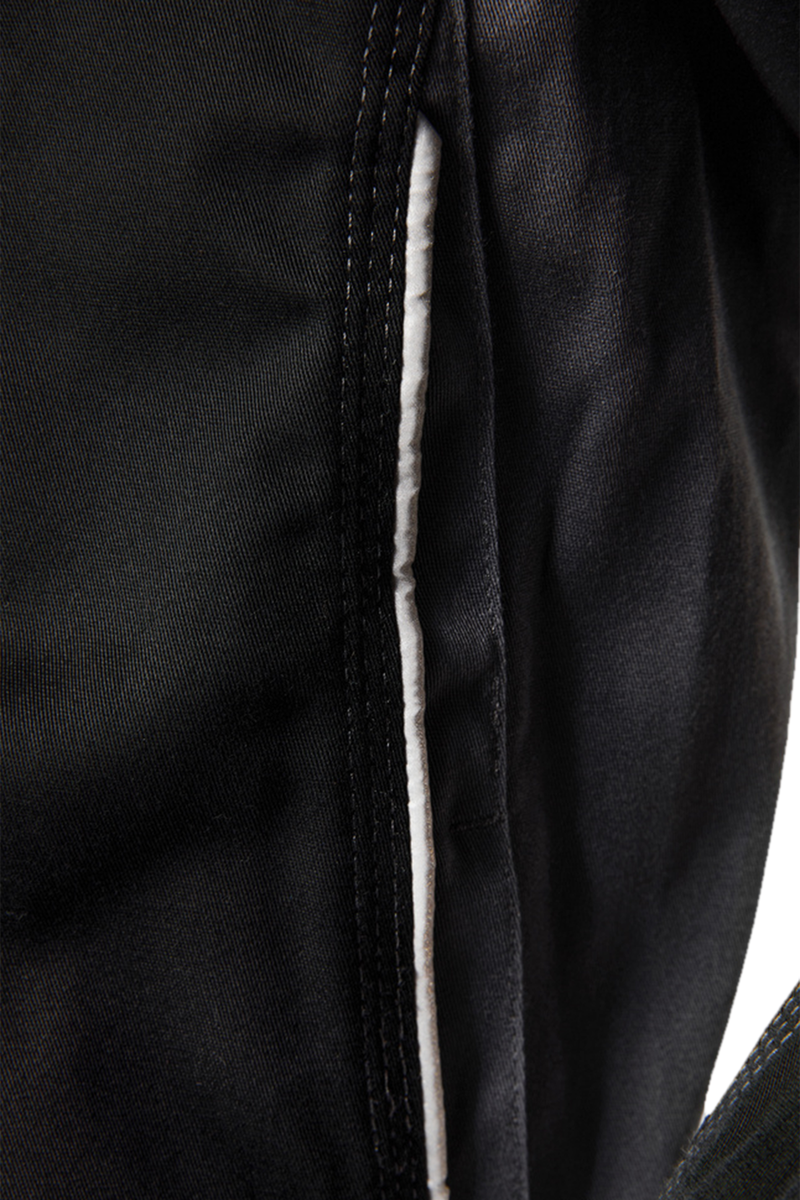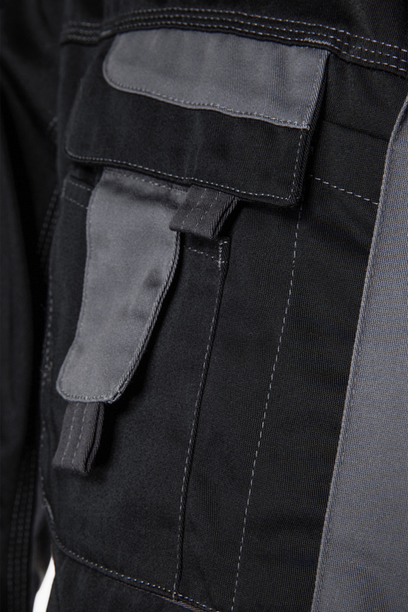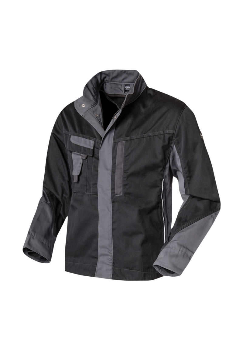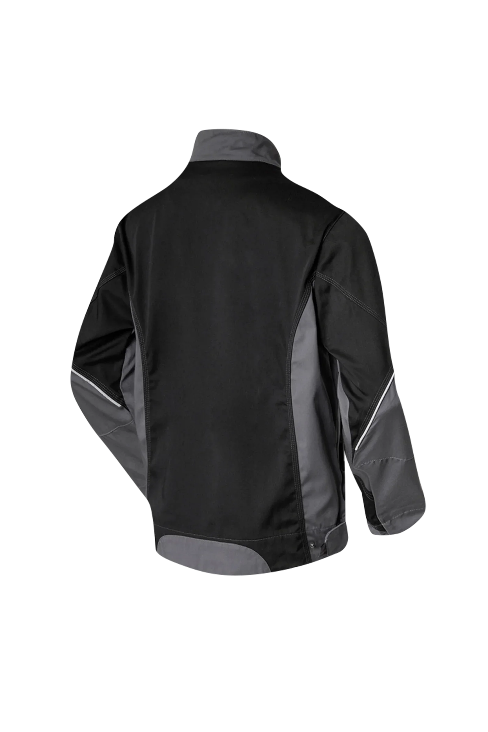 Two-tone waist jacket suitable for leasing, stand-up collar, concealed zipper, two inset side pockets with concealed zipper, inside pocket, one inside inset chest pocket with concealed zipper, one patched bellows chest pocket with flap, pen pocket, patched mobile phone pocket on the right chest pocket, extra long back, inner knitted cuffs, inner press studs for buttoning in an inner vest, waistband width adjustment with press stud tab, reflective piping on the front and elbows