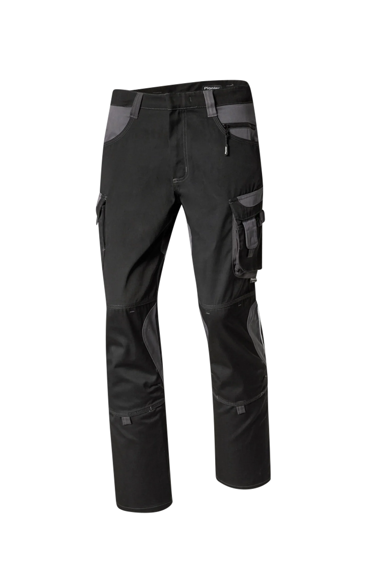 two-tone waist trousers with raised waistband, stretch inserts in crotch and waistband, two patch thigh pockets with bellows and flap, left with slanted mobile phone pocket and pen compartment, folding rule pockets on the right and left, zipper in fly, concealed waistband button, zipper pocket above the left side pocket, pre-shaped knee pad pockets, can be combined with the Pioneer knee pad (W8 90020), two back pockets, the right one with flap and Velcro fastener, six belt loops, reflective piping